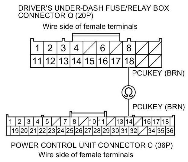 11. Check for continuity between driver's under-dash fuse/relay box connector Q (20P) terminal No. 18 and power control unit connector C (36P) terminal No. 14.