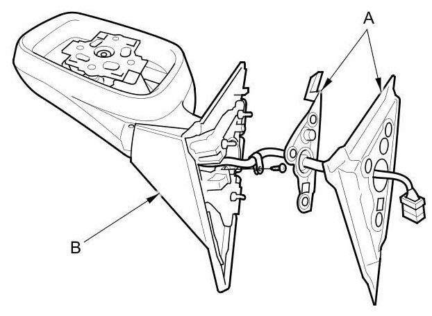 3. Remove the gaskets (A), then remove the screw and cord from the mirror bracket (B).