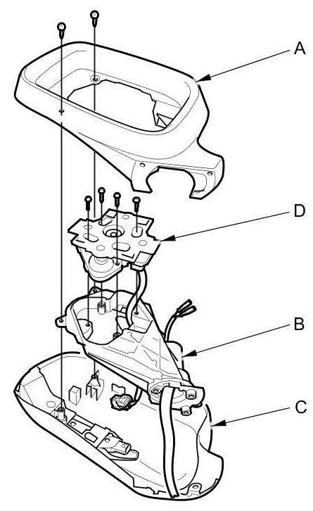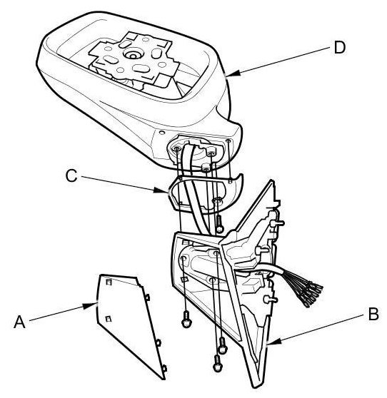 6. Remove the three screws, separate the mirror bracket (B), then remove the screw, and separate the seal (C) from the housing (D).