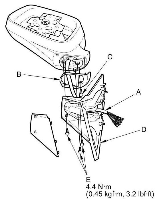 12. Reassemble the mirror in the reverse order of removal. Apply LOCTITE to the three screws (E) and tighten to 4.4 Nm (0.45 kg-m, 3.2 lb-ft).