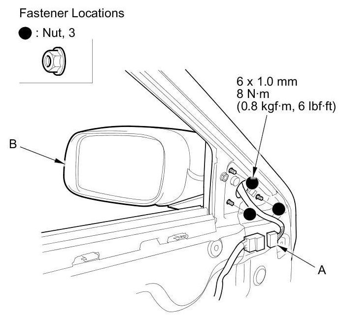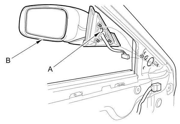 3. While holding the power mirror (B), remove the nuts securing the mirror.