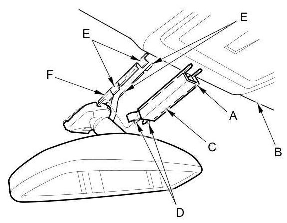 1. Slide the rearview mirror harness upper cover (A) forward to release it from the headliner (B). Pry out the rearview mirror harness lower cover (C) to release the hooks (D), then slide the lower cover rearward, and remove the lower cover by releasing the hooks (E) on the rearview mirror harness cover base (F).