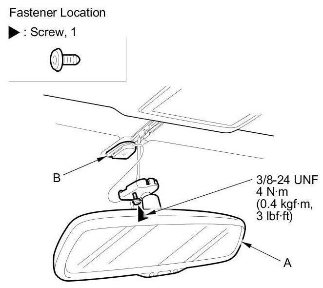 3. Loosen the TORX screw with a TORX T20 bit, then slide the rearview mirror (A) rearward and off the mount (B).