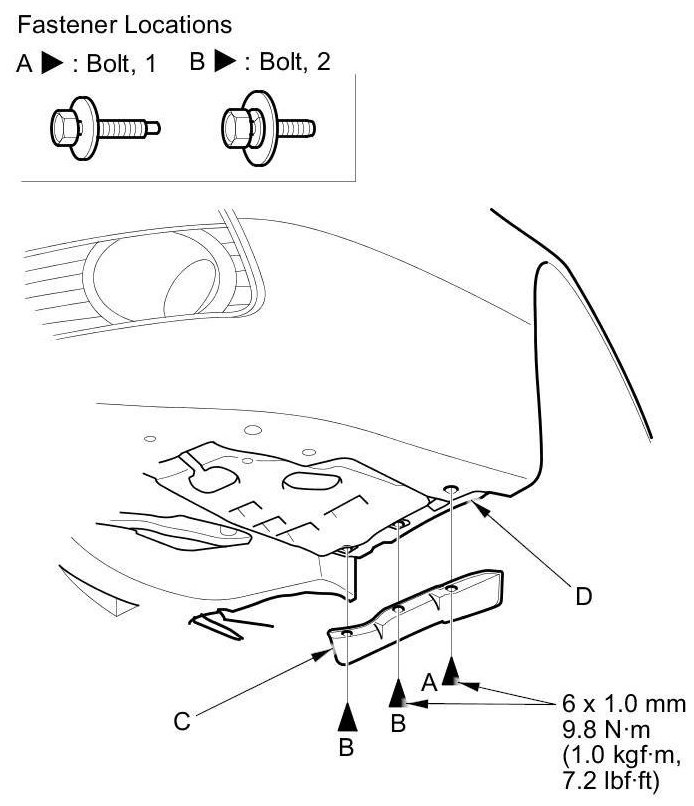 1. Remove the bolts (A, B). Release the front strake (C) from the front inner fender (D), then remove it.