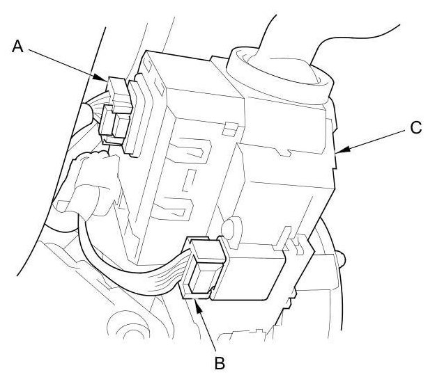 4. Disconnect the combination light switch 12P connector (A) and the steering angle sensor 5P connector (B) from the combination switch assembly/cable reel (C).