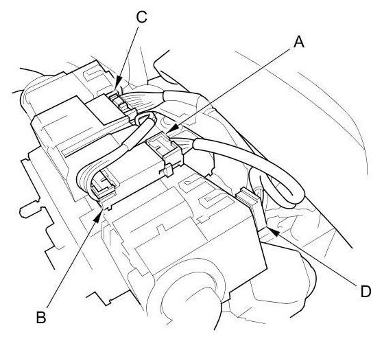 5. Disconnect the dashboard wire harness 4P connector (A) from the cable reel 4P connector (B), then disconnect the dashboard wire harness 20P connector (C) and the wiper/washer switch 8P connector (D).