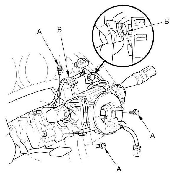 6. Remove the combination switch assembly/cable reel mounting screws (A).