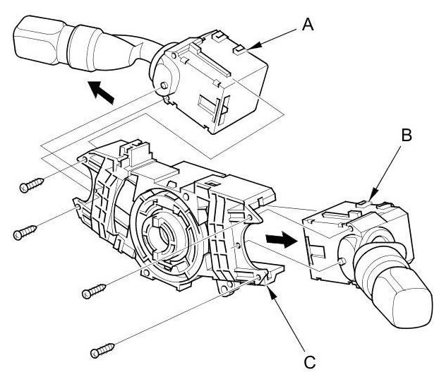 9. Remove the combination light switch (A) and the wiper/washer switch (B) from the combination switch body assembly (C).