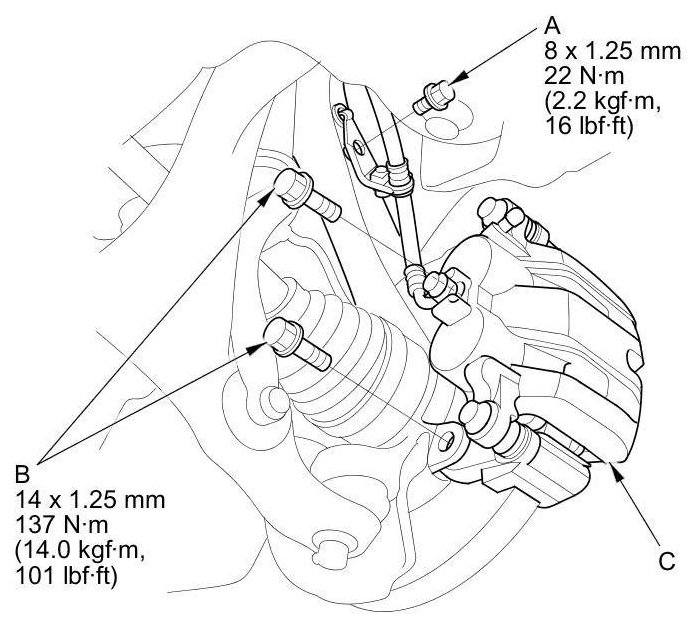 4. Remove the brake caliper bracket mounting bolts (B), then remove the caliper assembly (C) from the knuckle. To prevent damage to the caliper assembly or brake hose, use a short piece of wire to hang the caliper assembly from the undercarriage. Do not twist the brake hose excessively.