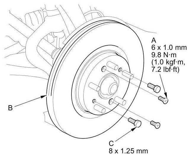 NOTE: If the brake disc is stuck to the front hub, thread two 8 x 1.25 mm bolts (C) into the brake disc to push it away from the front hub. Turn each bolt 90 degrees at a time to prevent the brake disc from binding.