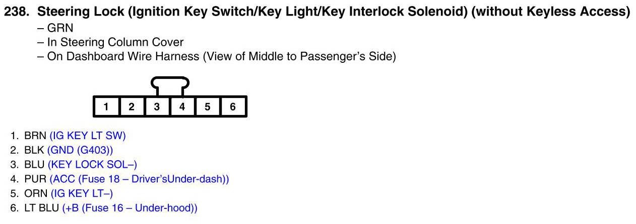 Steering Lock (Ignition Key Switch/Key Light/Key Interlock Solenoid) Connector View (Without Keyless Access)