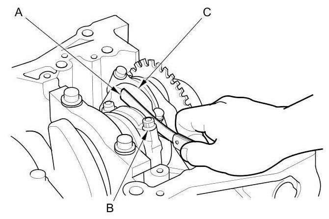 3. Measure the connecting rod end play with a feeler gauge (A) between the connecting rod (B) and the crankshaft (C).
