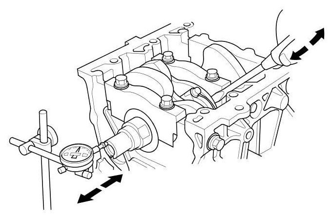 5. Push the crankshaft firmly away from the dial indicator by prying, and zero the dial against the end of the crankshaft. Then pull the crankshaft firmly back toward the indicator by prying; the dial reading should not exceed the service limit.