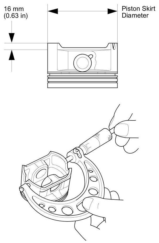 3. Measure the piston skirt diameter at a point 16 mm (0.63 in) from the bottom of the skirt.