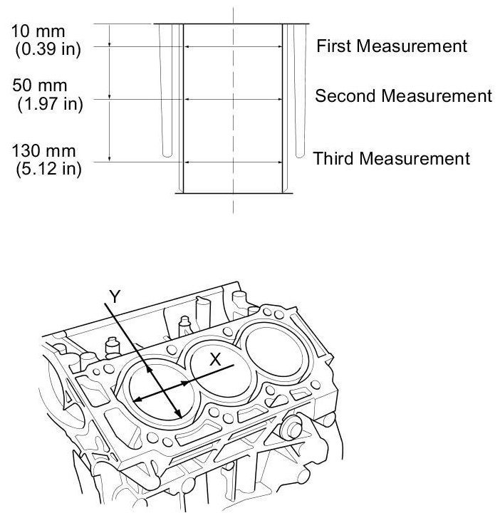 4. Measure the wear and taper in direction X and Y at three levels in each cylinder as shown.