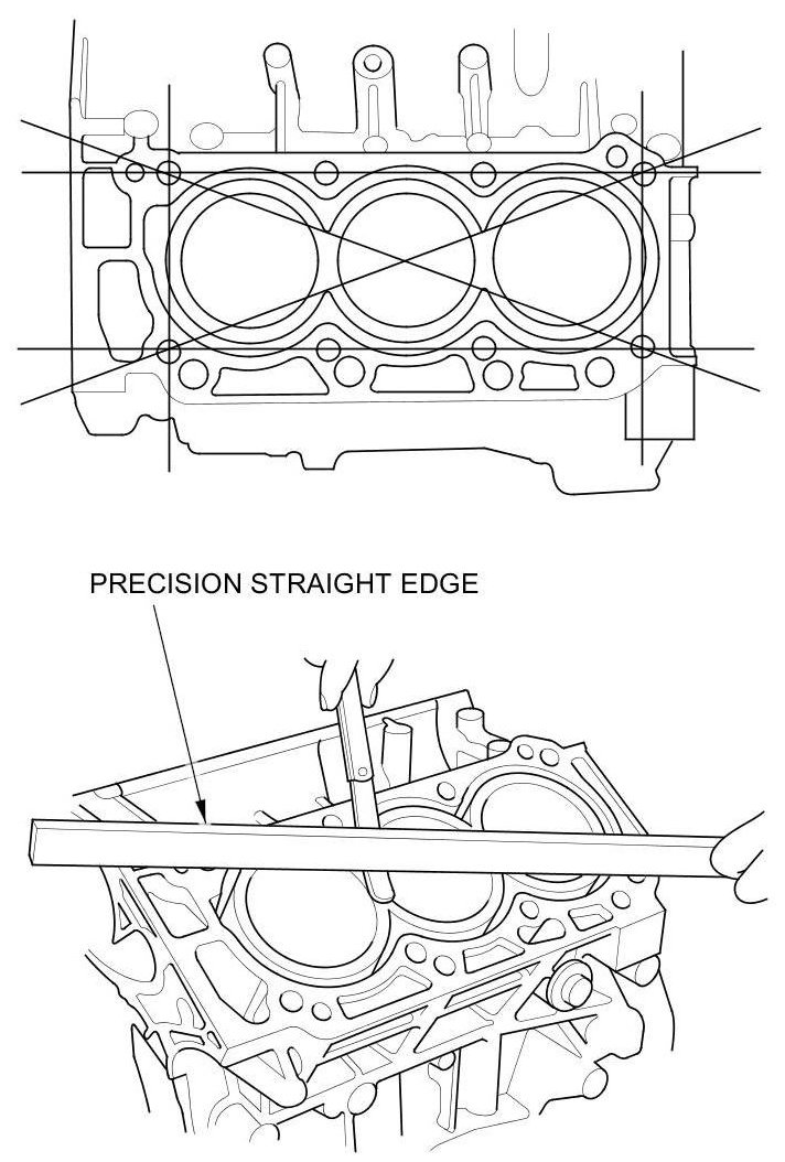 7. Check the top of the engine block for warpage. Measure along the edges and across the center as shown.
