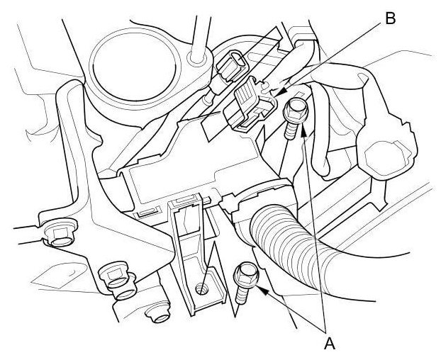 4. Remove the harness holder mounting bolts (A) and disconnect the knock sensor connector (B).