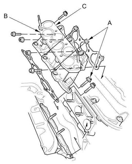 5. Remove the injector base mounting bolts/nuts (A), then remove the front injector base (B) and the rear injector base (C).