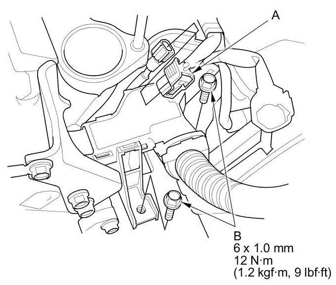 2. Connect the knock sensor connector (A), then install the harness holder mounting bolts (B).