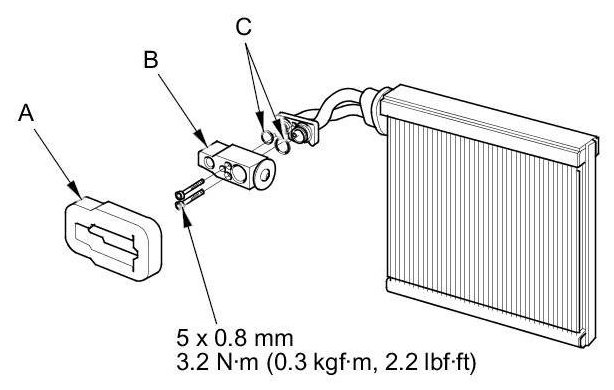 2. Remove the insulator (A) and bolts, then remove the expansion valve (B) and the O-rings (C).