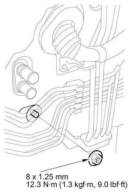 6. Remove the mounting nut from the heater unit. Take care not to damage or bend the fuel lines or the brake lines.
