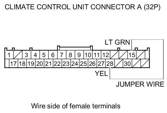 6. Connect climate control unit connector A (32P) terminals No. 15 and No. 28 with a jumper wire.