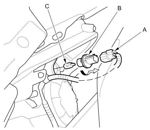 3. Turn the bulb socket (B) 45 ° counterclockwise to remove the bulb (C).