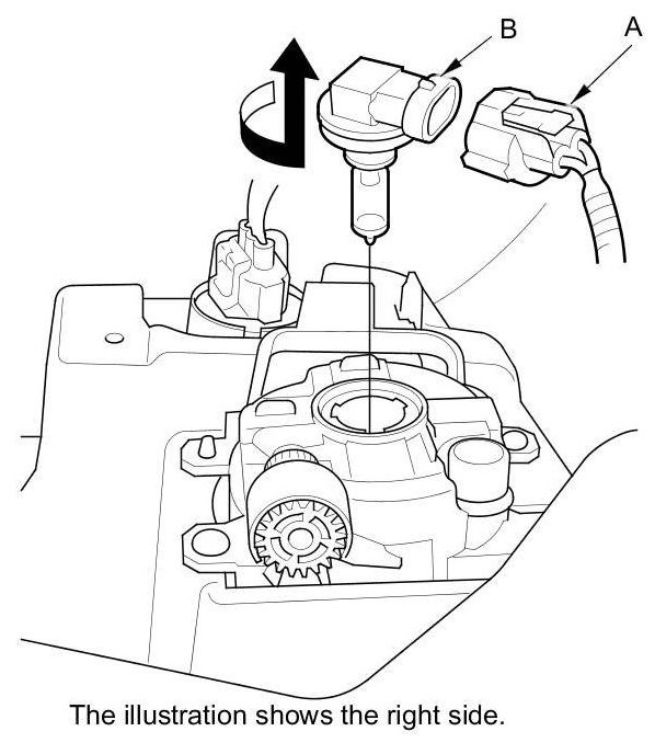 4. Turn the bulb socket (B) 45 ° counterclockwise to remove the bulb.
