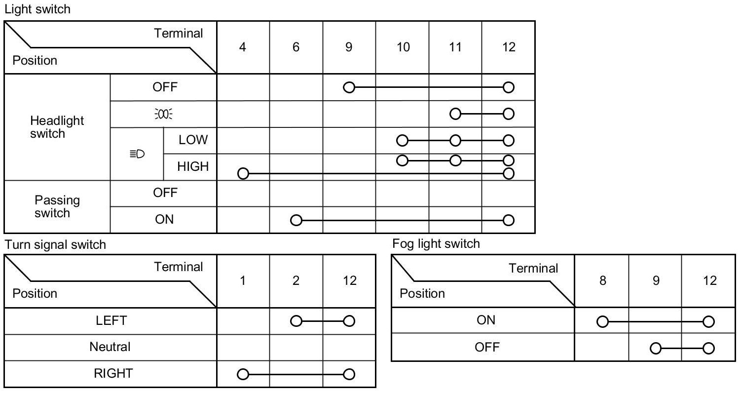 - If the terminals look OK, check for continuity between the terminals in each switch position according to the tables.