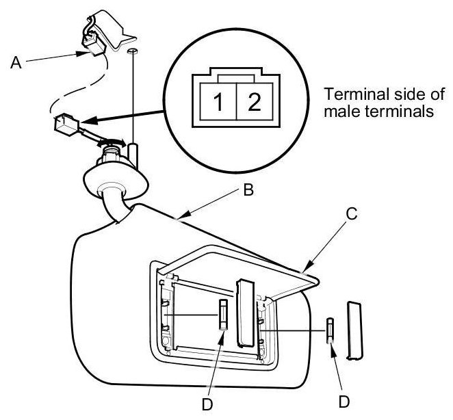 4. If the continuity is not as specified, check the bulbs (D). If the bulbs are OK, replace the sunvisor Service and Repair.