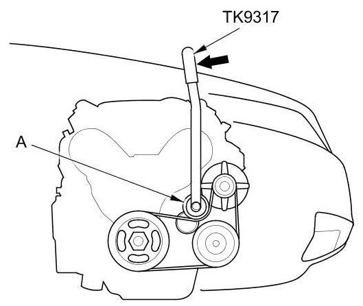 2. Move the auto-tensioner (A) using the belt tension release tool (TK9317) in the direction of the arrow to relieve tension from the drive belt, then remove the drive belt.