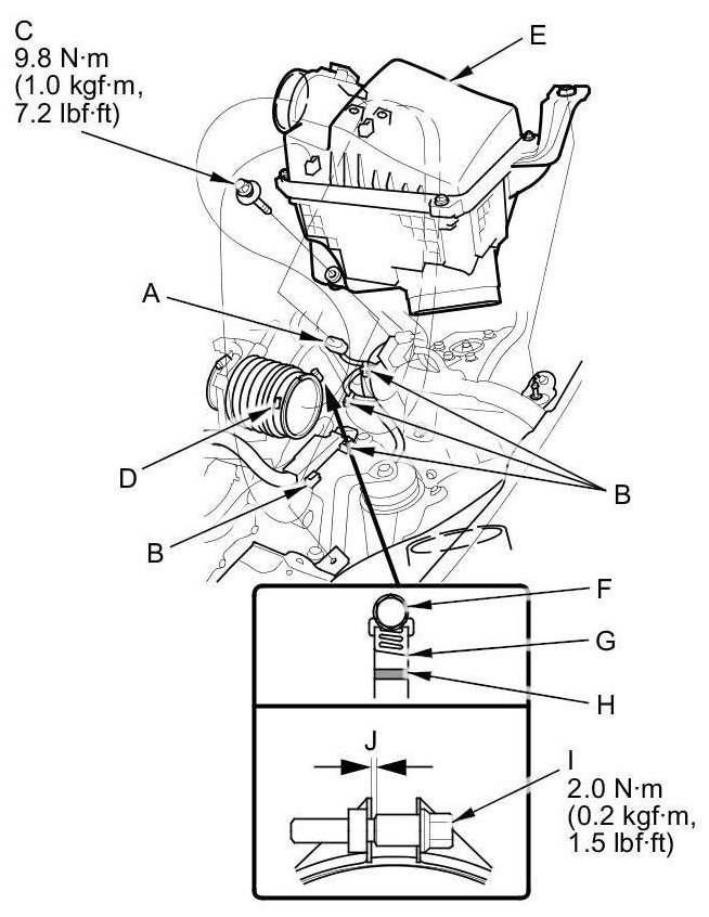 - J35Z6 engine:After you torque the hose clamp screw (I), make sure the clearance (J) is less than 0.04 in (1.0 mm).