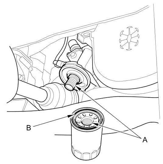 3. Inspect the threads (A) and the rubber seal (B) on the new filter. Clean the seat on the oil filter base, then apply a light coat of new engine oil to the oil filter rubber seal. Use only filters with a built-in bypass system.