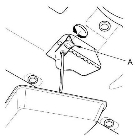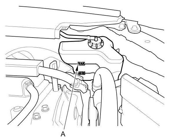 8. Fill the coolant reservoir to the MAX mark (A) with Acura Long Life Antifreeze/Coolant Type 2.