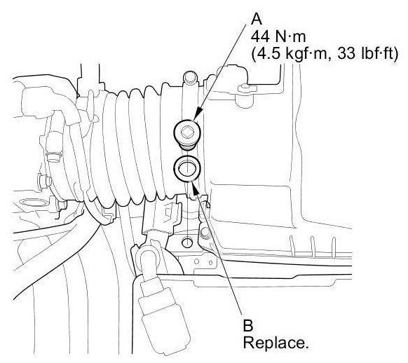 8. Refill the MTF from the filler plug hole on the transmission, until the MTF overflows from the fluid check bolt hole (A). Always use Acura Manual Transmission Fluid (MTF).
