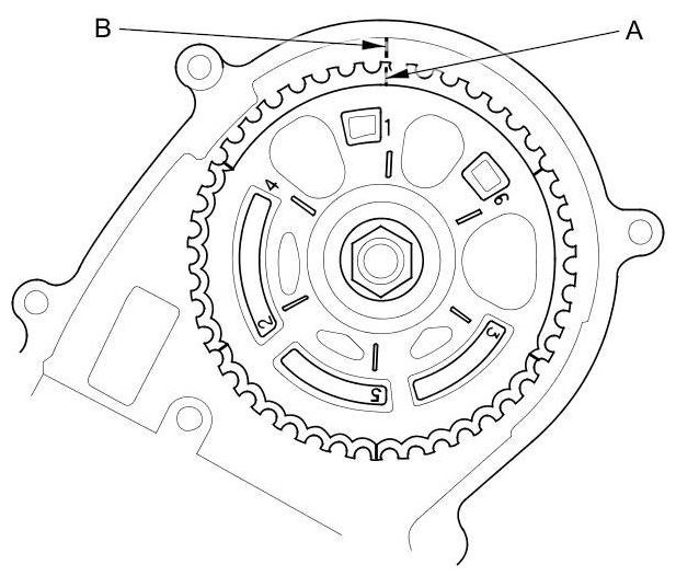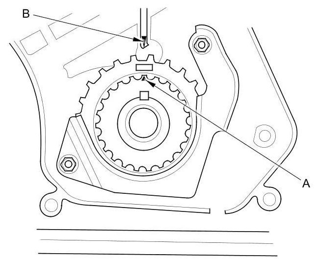 3. Set the timing belt drive pulley to top dead center (TDC) by aligning the TDC mark (A) on the tooth of the timing belt drive pulley with the pointer (B) on the oil pump.
