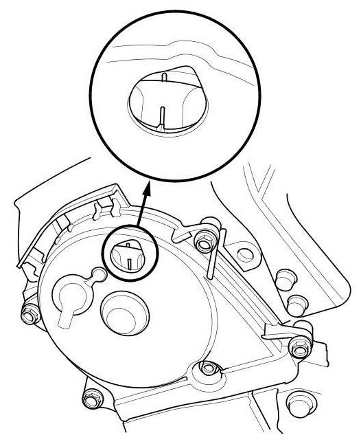 NOTE: If the marks are not aligned, rotate the crankshaft 360 degrees, and recheck the camshaft pulley mark: