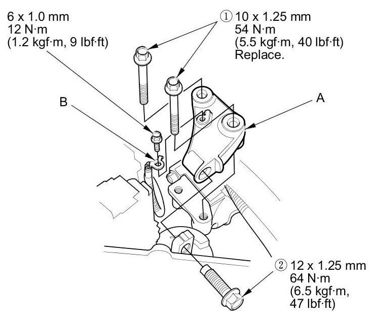16. Install the lower half of the side engine mount bracket using new bolts (A) and the bolt (B).