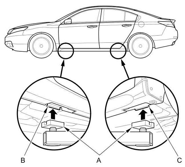 1. Position the lift pads (A) under the vehicle's front support points (B) and rear support points (C).