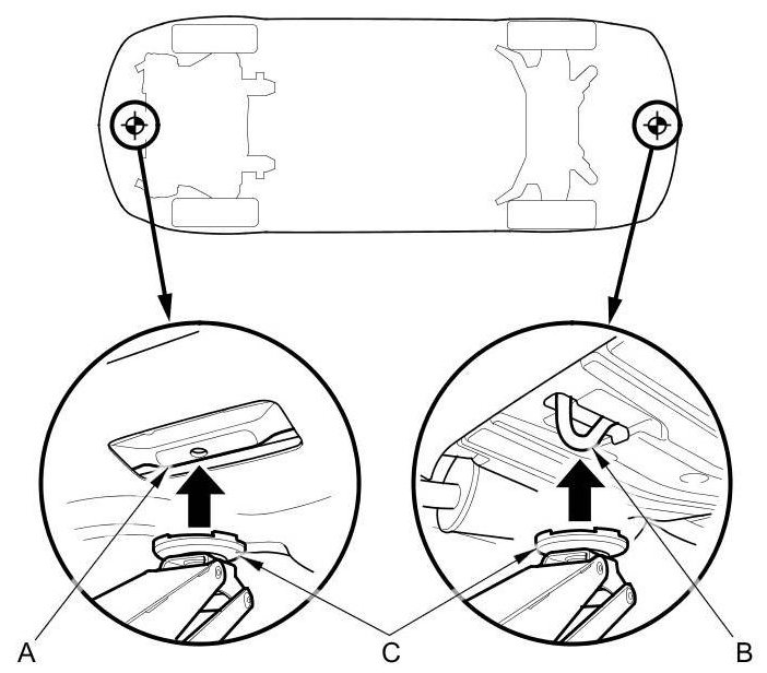 3. Position the floor jack under the front jacking bracket (A) or the rear jacking bracket (B). Center the jacking bracket on the jack lift platform (C), and jack up the vehicle high enough to fit the safety stands under it.