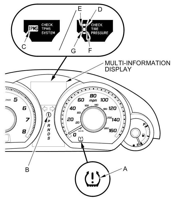 If the system is OK, the low tire pressure indicator should come on when you turn the ignition switch to ON (II), or press the engine start/stop button to select the ON mode, and then goes off 2 seconds later. If it does not, there is a problem with the system.