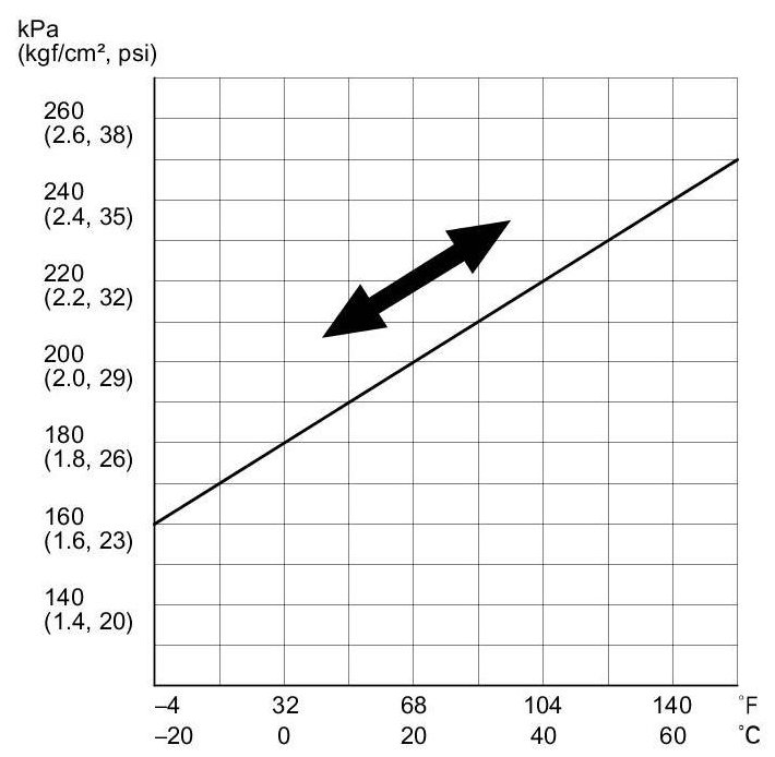 Tire pressures increase slightly as the temperature in the tires rises during driving. Pressures can also increase or decrease slightly with changes in outside air temperature. A temperature change of about 18 °F(10 °C) changes tire pressure by about 10 kPa(0.1 kgf/cm2, 1.5 psi). If the temperature drops, tire pressure could decrease enough to turn on the low tire pressure indicator and tire indicator(s), but later, the tire temperature could increase enough to turn indicator off. To resolve a complaint of such intermittent indications, confirm and clear the stored DTC(s) and check the tire pressures. Then explain to the client how temperature changes can affect the system.