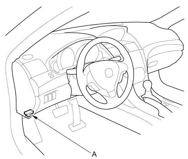 1. With the ignition switch in LOCK (0), or press the engine start/stop button to select the OFF mode, connect the HDS to the data link connector (DLC) (A) located under the driver's side of the dashboard.