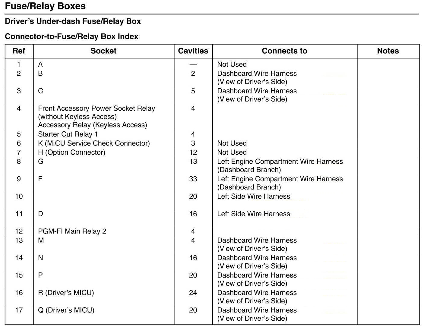 Driver's Under-dash Fuse/Relay Box - Connector-to-Fuse/Relay Box Index