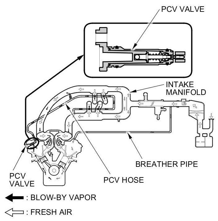 The PCV valve prevents blow-by gasses from escaping into the atmosphere by venting them into the intake manifold.