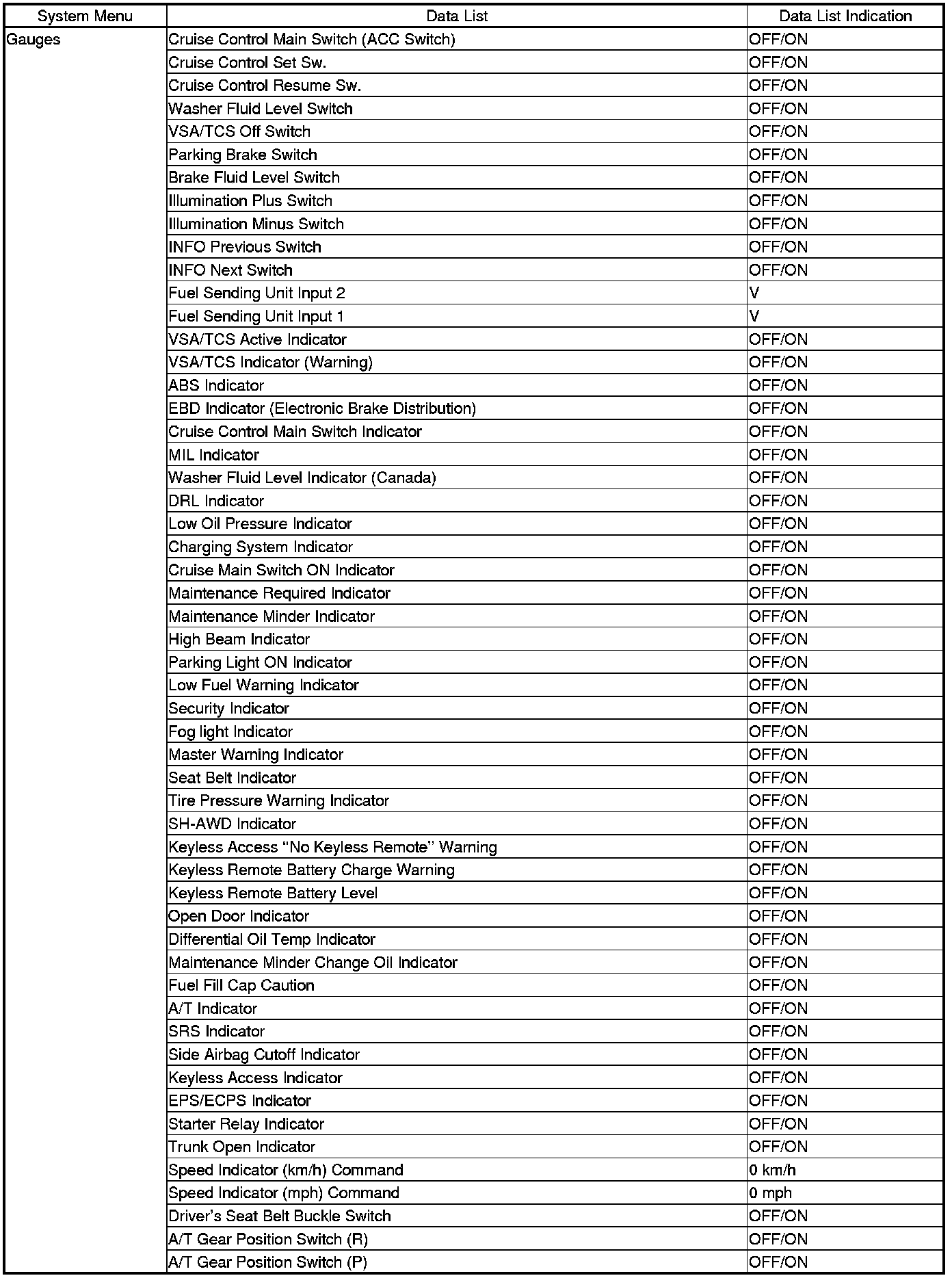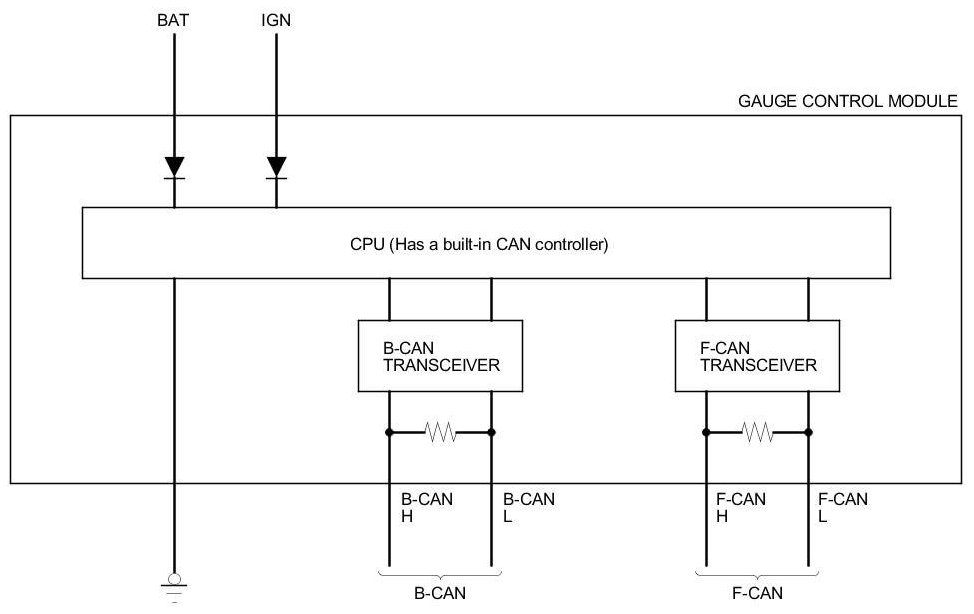 The body controller area network (B-CAN) and the fast controller area network (F-CAN) share information between multiple electronic control units (ECUs). B-CAN communication moves at a slower speed (125 kbps) for convenience related items and for other functions. F-CAN information moves at a faster speed (500 kbps) for "real time" functions such as fuel and emissions data. To allow both systems to share information, the gauge control module translates and relays the information from B-CAN to F-CAN and from F-CAN to B-CAN. This is called the Gateway Function.