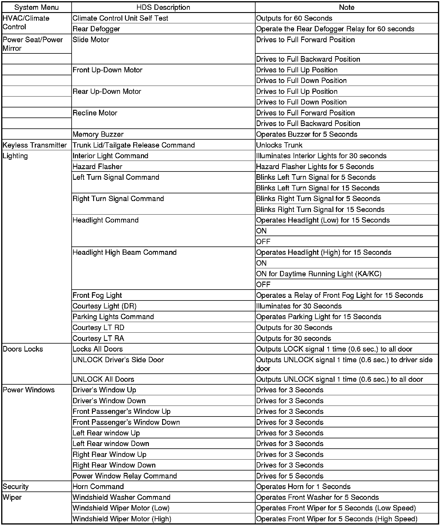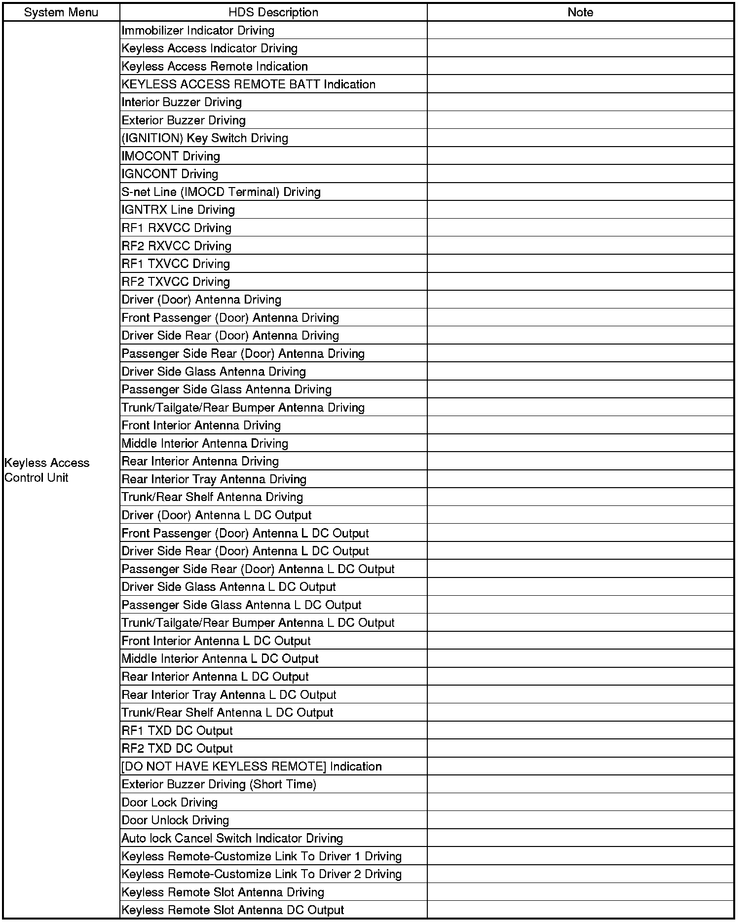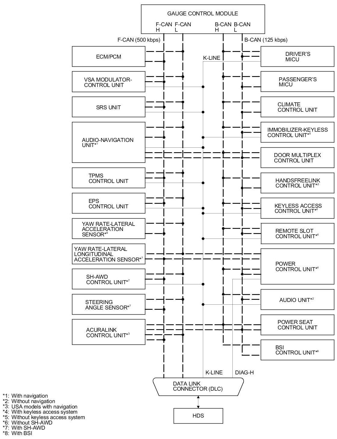By connecting the HDS to the data link connector (DLC), the HDS can retrieve the diagnostic information from the driver's MICU via a diagnostic line called the K-LINE. The K-LINE is a separate communication line from the CAN lines, but it is connected to most of the CAN related ECUs. The driver's MICU is a gateway between the HDS and B-CAN related ECUs, and sends B-CAN diagnostic information to the HDS. When doing a function test with the HDS, the HDS sends an output signal through the K-LINE to the driver's MICU. The driver's MICU either relays the request to another ECU, or commands the function itself.