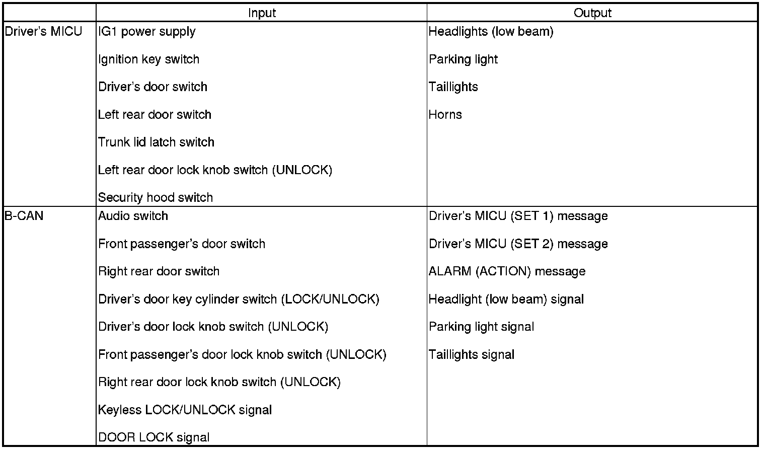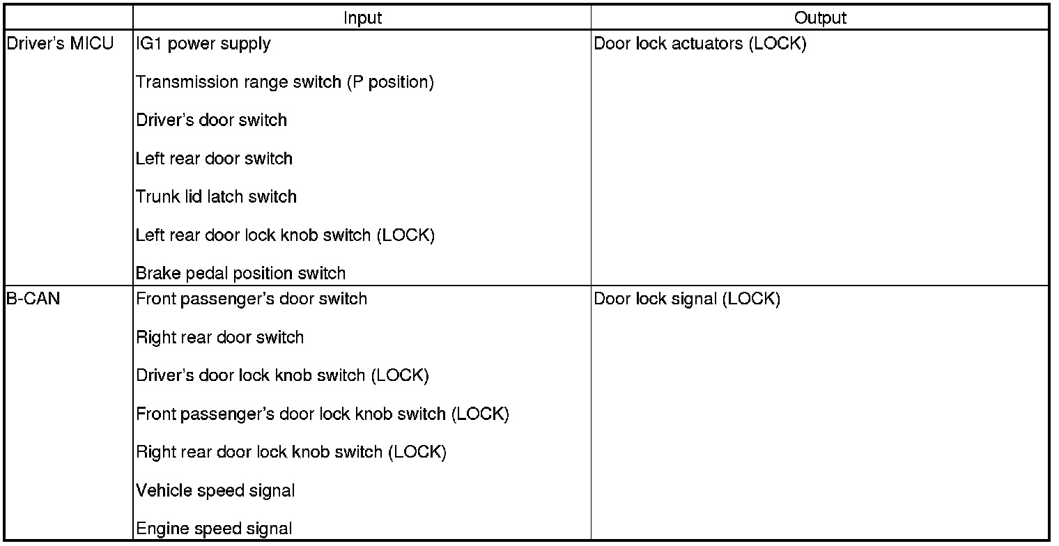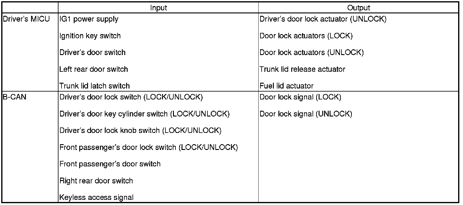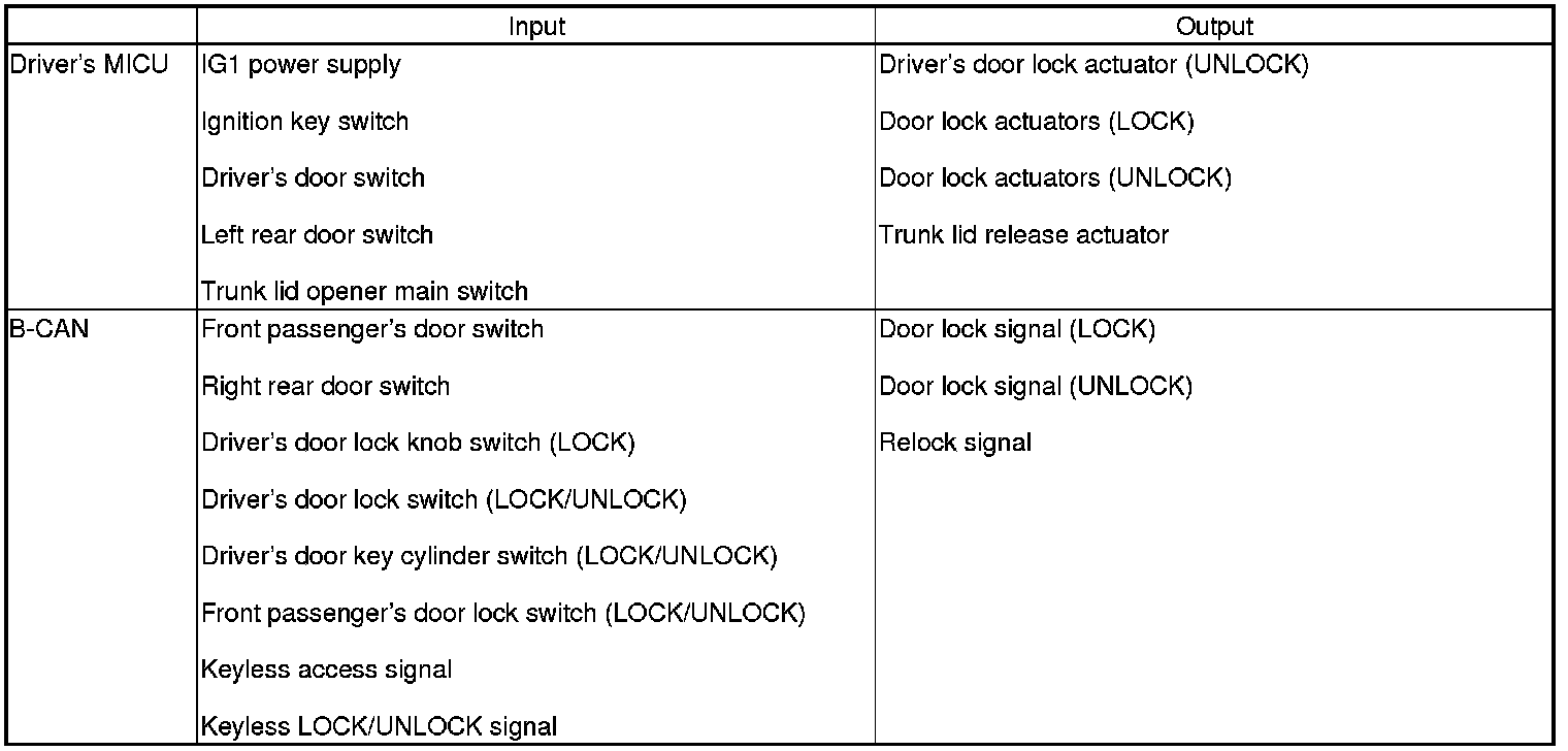 The driver's MICU controls the door lock actuators LOCK, UNLOCK, DRIVER'S UNLOCK, TRUNK UNLOCK based on B-CAN door lock switch signals.