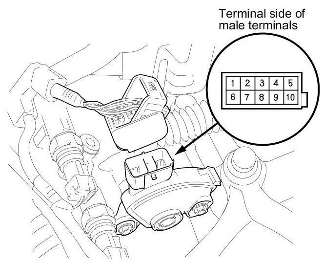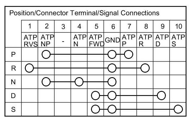 3. Check for continuity between the terminals at the transmission range switch connector. There should be continuity between the terminals in the following table for each transmission range switch position.