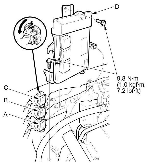 8. Disconnect ECM/PCM connectors A, B, and C, then remove the ECM/PCM assembly (D).